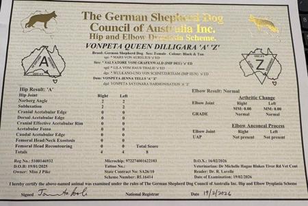 After 53 years VONPETA kennels is in its twilight and offers for sale the outstanding female Vonpeta Queen Dilligara AZ. She is the daughter of dual Silver medal winner Ch Salvatore vom Grafenwald out of a daughter of Gold medal winner Wulkano-Uno von Schnitzerteam. Born 19 January 2025 Dilli is a true stunner who would stand any temperament/character test. Would be a good foundation bitch for someone starting out or just make an outstanding family companion. Price $5000 firm.