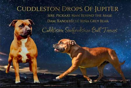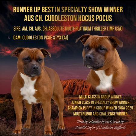 Located in the Brisbane QLD Region. Breeding & Showing true to type, temperament, conformation, and health - Staffordshire Bull Terriers. Each mating is carefully planned well in advance. We do have studs available for service to approved bitches. Please send details of your bitch through to us via text message to enquire. Parents are health tested clear of genetic and hereditary disease -- Degenerative Myelopathy, Hereditary Cataract, L2-Hydroxyglutaric Aciduria -- TESTED CLEAR. Puppies are chiropractic checked prior to leaving for their new homes. We crate train from 5 weeks, temperament test at 4, 6 and 8 weeks to pair pups with the right home, wean pups onto a hybrid diet of raw and biscuits. We implement crate training, potty training, introduction to basic commands, and discourage nipping using redirection. Well socialised with children and cats. Vaccinated, microchipped, vet checked, with puppy packs, pedigree papers, life time support and an exclusive membership to our Cuddleston Families group where I provide ongoing check ins and advice. PARENTS ARE ALL PHPV EYE TESTED CLEAR We do have litters planned for 2026 - Text us directly or find us on Facebook to enquire