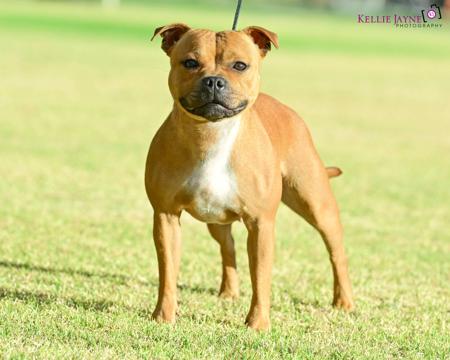 I have been personally involved with the Staffordshire Bull Terrier breed since I was 16 years old and have been successfully showing and breeding them for the last 12 years. The Staffordshire Bull Terrier has a very special place in my heart because to me they represent the perfect ‘all rounder’ type of dog. They are lovable, brave yet also sensitive, great with kids, easy to handle and live with (if socialised and trained correctly). This breed has brought me so much joy over the years and I can’t imagine my life without one. My dogs are DNA health tested to ensure they are not affected by HC, L2HGA and DM so I can feel comfortable that I am breeding dogs that are the best and healthiest example of the breed. I feed a raw food diet to help support a strong and healthy immune system so they can continue to be active and cherished members of the family. Lastly, a word about temperament. This is a breed that is naturally tenacious and so it is very important that all puppies are socialised from a young age so that they can grow to understand the world around them and not feel fearful or defensive around strange people or other animals. A well rounded stafford should be a dog that is able to accompany their owner anywhere with ease and after all that is the lifestyle that they also enjoy the most! I do breed occasionally and welcome you to contact me if you have any further questions.
