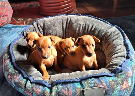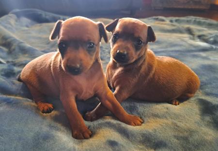 We are a registered stud, breeding for the love of Miniature Pinschers. These dogs make wonderful companions; high energy but self-exercising, very loyal and loving to their family, easy to look after and simply beautiful. There are no two Minpins that are alike, each has its own very distinctive personality and very own endearing characteristics. Our dogs are part of the family - the wee folk as we like to call them. We are based in rural NSW (near Armidale) where the dogs have free access to several acres of garden - multitudes of fascinating smells and things to do, whilst being kept safe in a securely fenced area. The Min Pins eagerly take part in any trip to other parts of the property, and love nothing better than helping their humans with whatever jobs come up. Our Minpins currently represent most of the main colour varieties (black and tan, chocolate and tan, and red) and are actively involved in the North and North-West dog show circuit. We are expecting two litters late October and another early November. We have one red boy who will be ready to go 20 October.