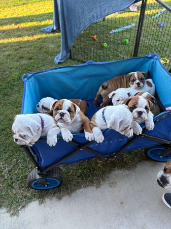 We are proud registered Breeders based in Regency Downs, Qld 4341. Prefix: LilPotatoes Dogs Qld Member No. 4100289552 We have 8 stunning Red & White British Bulldog puppies (6 girls & 2 Boys) looking for their new loving families. Our gorgeous puppies have been raised in a warm family home, surrounded by children of all ages and other animals, making them well-socialised and bursting with personality. Puppies come with the following: Microchipped Vaccinated Wormed DNA Tested through Orivet Full Health Checks during all Vet Appointments Limited Register Toilet Trained Eating Royal Canin Dry/Wet Food Both parents are pure bred and have such loving natures. We are more than happy to share additional photos or videos to help you find the perfect puppy to welcome into your home. We can also arrange transport to anywhere in Australia, with costs covered by new owners. British Bulldogs are known for forming strong bonds with their families and are very gentle around children. They are very calm and laid back and are often described as cuddly companions with big personalities.