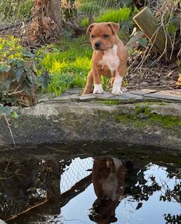 We are a small breeder, and breed Staffordshire Bull Terriers on a limited & very selective basis in order to produce quality Staffordshire Bull Terriers that are structurally & genetically sound with good true type & temperament. To accomplish this we maintain high breeding standards & practices- all breeding stock are Orivet DNA profiled, DNA tested for L2-HGA, HC, Degenerative Myelopathy & eye tested we also adhere to the belief that all dogs deserve responsible & loving owners & our puppies are only sold to those who meet certain criteria - all our puppies are brought up in the house with all the other dogs as part of our family!!