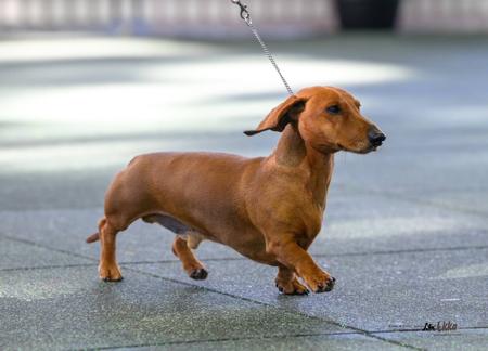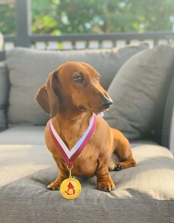 Henry has sired a number of beautiful litters, passing on his steady, placid temperament to his progeny. Many of his progeny are doing well in the show ring and have achieved Champion status. He was awarded 3rd place in the Sire and Progeny Sweepstakes class at the 2023 Dachshund National under USA judge Dan Harrison and was the highest placed Miniature Smooth in the Sire and Progeny class. Henry is DNA tested, PRA clear, SDMD clear and has been x-rayed and back scored and approved for breeding. He won Runner Up Best In Show at an All Breeds Show in 2024 and is a multi Best in Group winner. He also was awarded Runner Up Best In Show at the Dachshund Club of Qld specialty show in August 2025 out of an entry of 79 dachshunds.