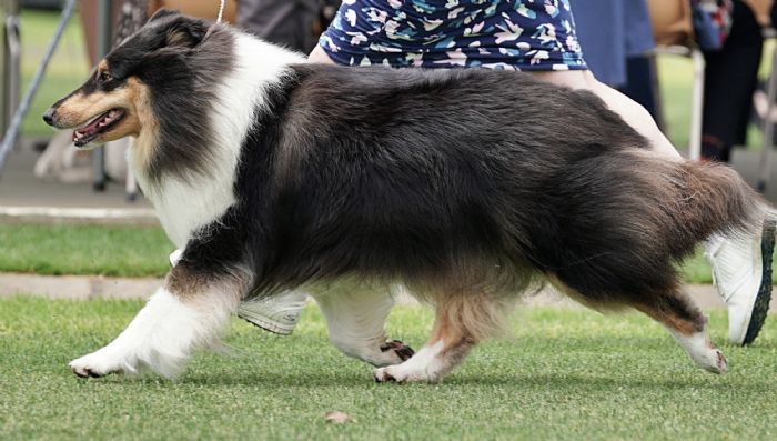 Another 4 year old tricolour bitch. This bitch had a heavier head, which was too strong for me. Excellent breed type, well coated, used her ears well, also she was a bit of a clown!! Outline very good, with a lovely turn of stifle and short hocks. Movement just excellent – and it won her the Best Gaited Class.