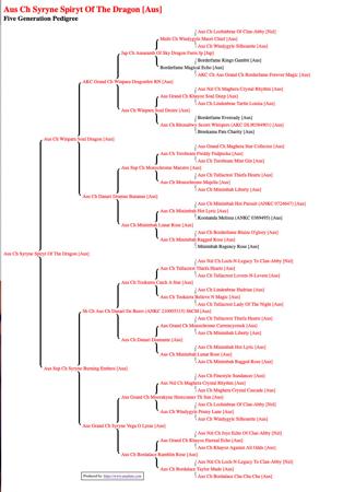 | Pedigree for TS GR CH, T GR CH, MULTI CH Syryne Spiryt Of The Dragon RAE CD PT SPRD | ||