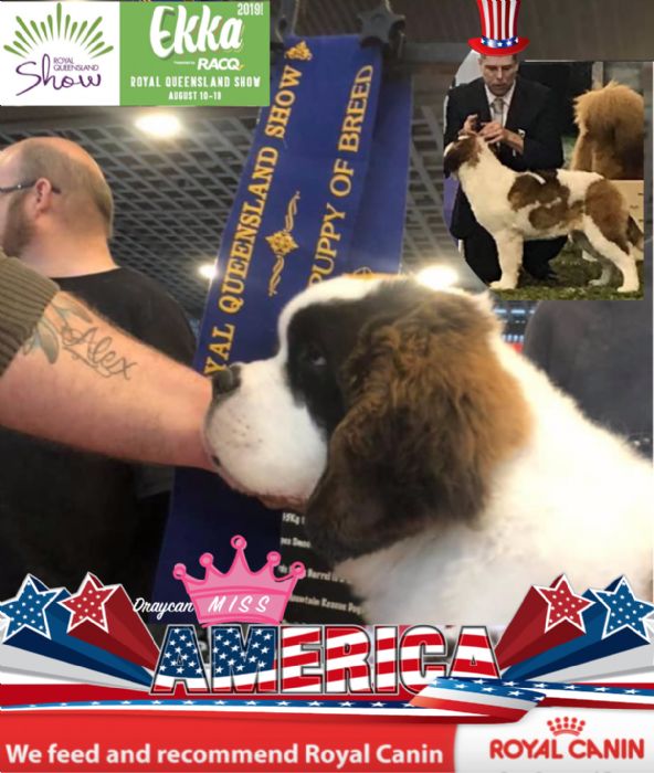 Indy made the move from USA to Australia and has contributed to further development of the Saint Bernard breed here down under in Australia, With her son Chad (Reserve Best Exhibit in Show 2019 St Bernard Club QLD) Sire is Aust CH. Snobound Eldarado "Brian" owned by Draycan Kennels Brian was selected to join the kennel for the American lines behind him producing large solid heads with dense bone but just because a dog has these American lines they will need matching to the right bitch for mating to get results and keep to the FCI Breed Standard. Daughter "Draycan Miss America" Sired by Alpine Man V Methusela "Judas" (Import USA) born 5th April 2019 will make her debut at the Queensland Royal EKKA Show 2019 as part of Ryan's Elite Saint Show Team, Then go on to have 1 or 2 litters under the draycan prefix to ad the the lines of selected Respected Ethical Australian Show Kennels to again, further development of the Saint Bernard down under!