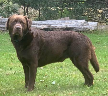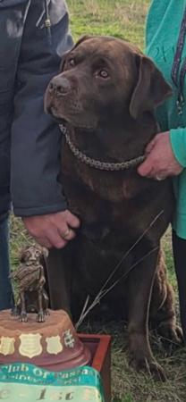 A proven Stud dog, has sired 3 litters, his first mating sired 12 beautiful Chocolate Labradors. He has sired another 2 litters of 10 and 8 beautiful Labradors.