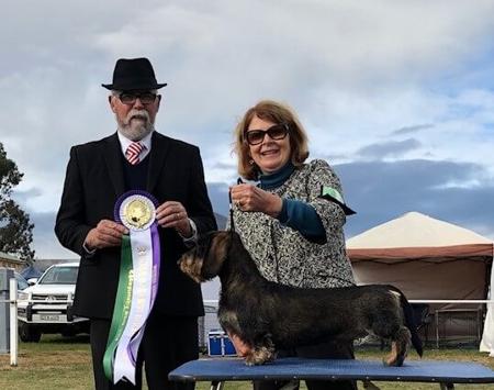 Helmut is a dark wild boar that loves the show ring. Winning numerous best baby, jr and puppy classes in show last year, he has also taken out runner up best in show at several large hound specialties in 2019 and many group classes, finishing No. 1 national showdog of the year for wire dachshunds in 2019 through 2021. He has the best disposition, a strong driving rear, beautiful head, great coat texture and type, and is siring some lovely litters for us and others. Sire of multiple champion litters. Frozen and chilled fresh semen shipment also available. Helmut was Rup dog challenge winner at the recent Dachshund National show in Brisbane and is now the sire of 4 separate Best in Championship or Specialty Show winners from different litters. He is the sire of 9 champions and counting in Australia with another in New Zealand in just 4 litters. Tested clear for the dachshund wire panel.