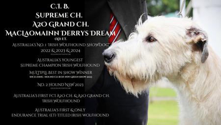 • BEST IN SHOW - Hound Club of NSW- Green Show (NSW) 2nd April 2023 (235 entries). The first Irish Wolfhound to ever win this show.