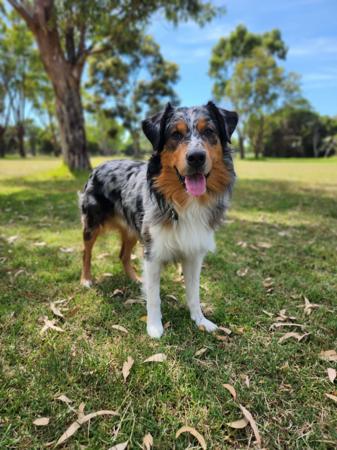Bluegum shows outstanding behaviour and attitude towards learning. Bluegum has so far spent many days as 'demo dog' for puppy school instructor training days, being a favourite amongst students. He also proudly represented his breed and the PETstock company at the 2023 Melbourne Dog Lovers Show, where he was on his absolute best behaviour. Bluegum showed off his gentle disposition and friendly attitude, socialising with all sorts of people from young children to large crowds to people in wheel chairs etc.