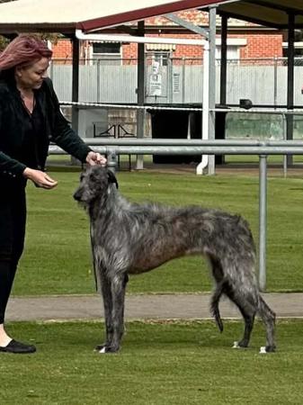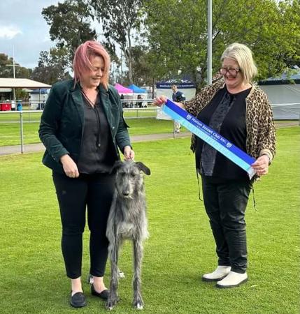 Daughter of Gr Ch Sallytree An Daor (Moth) and Ch Necesse's Dira Domina (Maze), Maggie at her very first shows - The Deerhound Club of Victoria - won Baby Puppy in Show at both the Open and Championship shows!