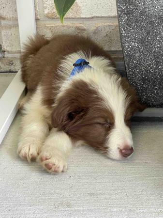 Leonardo (Leo) is a gorgeous Chocolate/White Border Collie. He has traditional, symmetrical markings and a stunningly affectionate and relaxed personality. He has sired a number of litters and the puppies have been gorgeous.