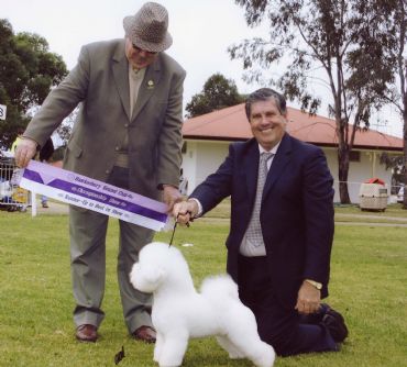 Known as “Baci”, the two year old champion Bichon Frise dog Kelzarki Rusmar Magic, is owned in New South Wales, Australia, by his breeders; Les Bradney and Tom Tancred, in partnership with Jenny Page.