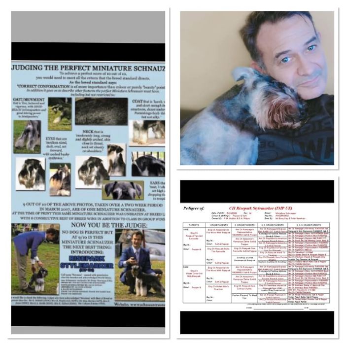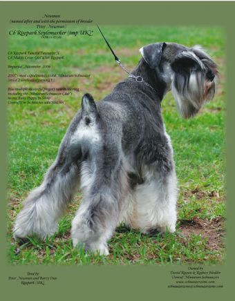 The arrival of Risepark Stylemarker sees the culmination of 2 years of planning. In addition to Barry Day & Peter Newman of Risepark Miniature Schnauzers United Kingdom, special thanks must go to Ralph Richardson of Workx Miniature Schnauzers. Back in May of 2006 we sat in a yard surrounded by puppies as well as quite a few well known adult dogs including the legendary, Ch Adamis Frontrunner. Behind us watching was Miniature Schnauzer breeder, exhibitor well known & respected Judge Mr Barry Day, & also Mr Peter Newman, author of numerous books on our breed, and one of the World's leading Miniature Schnauzer authorities. We were at Risepark Miniature Schnauzers, UK having just watched Mr Day judge over 120 Miniature Schnauzers at the Birmingham Nat. (2nd only to Crufts in size). Observations then, & Peter Newman's & Barry Day's observations since, has seen the arrival into Australia on QF2 on 17th November, 2006, of Risepark Stylemarker (IMP UK), who with Peter Newman's permission we have called 'Newman.' With a pedigree that reads like a 'who's who' of Minis, including the legendary Ch Rampage Representative, we are sure Barry Day was right when he said of Newman prior to exporting him to us, "All is well with Newman, he is going to have a superb head & long neck," (amongst other sort after traits.)