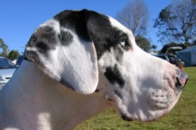 Aust Ch Hildydane Olympiah is an outstanding perfectly marked harlequin Great Dane. Tall and elegantly built with strong American lines. She was critiqued at the Great Dane Specialty Show in Sydney, 2006, as having excellent top and underlines, coupled with a perfect tail set. Her strong forward reach and incredibly strong hindquarters make her one of the best moving Danes in the ring today.