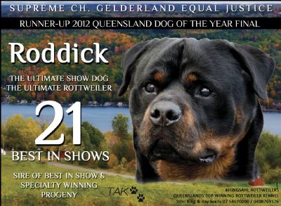 Roddick is one of the few Rottweilers in Australia to win Best In Specialty Shows as well as Best In All Breed Shows.