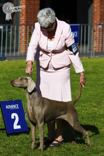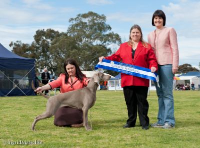 Moët has been out of the show ring for several months with an injured foot but is back! Junior In Show at the SA Weimaraner Champ Show on 23/7/11 under breed judge Mrs I Albion (T). The next day at the second Wei Champ Show she goes one better and wins Res Bitch CC and Junior In Group under Mrs A Hennigan (Canada)