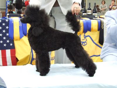 Brodie has had a very successful career in my hands winning Baby Puppy in Show under Ann Kennedy (USA) Clarion Poodles, Minor of Breed at The National in Perth under Mikael Nilsson(Swed) Kudos Poodles and Minor Puppy in Show under Joan Scott (USA)Wissfire Toy Poodles and Res Chall at his first Royal Melb show at 11 months of age. He was then flown to Christine Kiernan (Tas) to fullfill his showing and breeding career but alas Christine had a nasty accident fracturing her hip and becoming totally incapacitated for a long time so Brodie was flown for a temporary visit to West.Australia.
