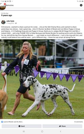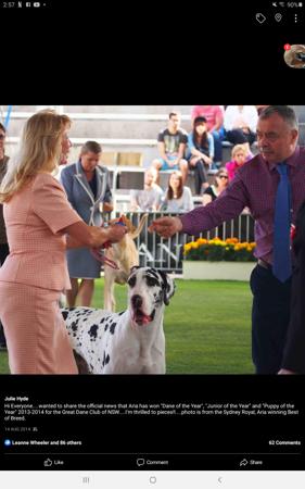 STOP PRESS......at 16 months old Aria wins BEST of BREED Sydney Royal 40 danes entered and then takes a Group 4 on General Specials Day.