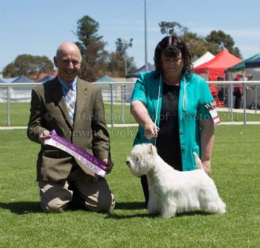 June 2014 at the WHWT Club of a Victoria Ch show under Liselotte Johannson (Sweden) Nandos wins BEST EXHIBIT IN SHOW