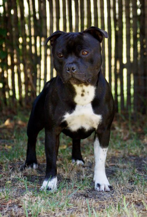 A very smart black brindle with white, fantastic head ratio, deep through skull with strong underjaw, short foreface, deep stop, darkest of eye, and typical neat rose ears. Strong powerful neck leading into correct shoulders, dead straight front with ample bone, chest deep enough with good length to rib, rear quarters spot on for a Stafford. moved really well and handled to an advantage. Very nice dog RESERVE DOG CC IN SHOW
