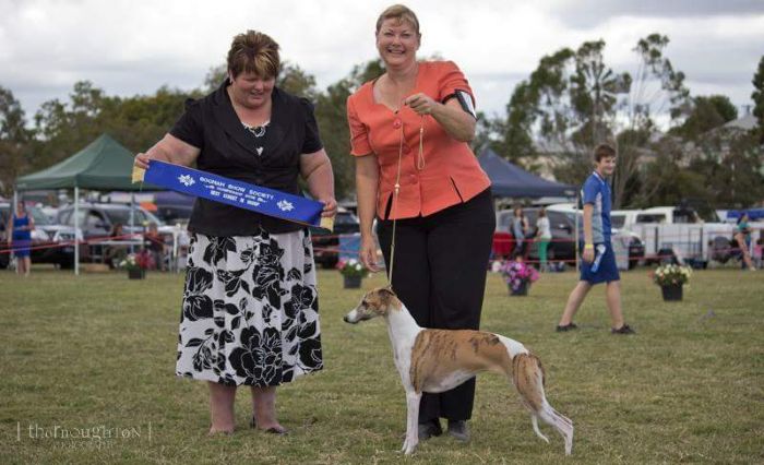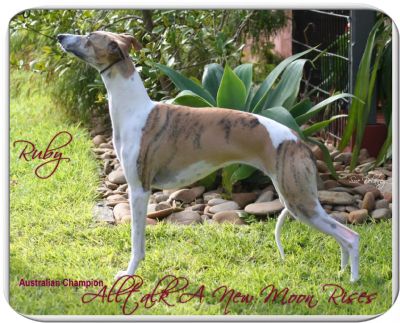 Ruby in the show ring did things in style winning a BIG to make up her Australian Title she was was certainly no slouch and won multiple BIG and classes in group. These days much prefers cuddles and the Lounge or curling up on the end of the bed to being in the show ring and started my love of Whippets.
