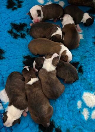 Our Amstaff Pups have arrived! Happy Healthy Little Monsters Sire - Eric / AKC CH Rebel Eric de Cans Juansa X Dam - Shelby / CH Kabere Princess of Ringmaster Thanks to everybody who made it all possible! After 25 years breeding this will be one of our last Amstaff litters. Couple of Reservations Still Available.