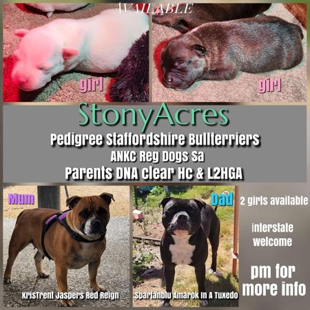 StonyAcres Staffordshire Bullterriers has welcomed 7 beautiful pups from Hazel X Jasper 2 white & red pied boys, 1 red boy, & 1 red girl available at this stage! Deposit required to hold. Located near Pt Wakefield Sa Can fly interstate $2800 on Limited Pedigree Papers $3500 on Mains Pedigree Papers Please message for more info