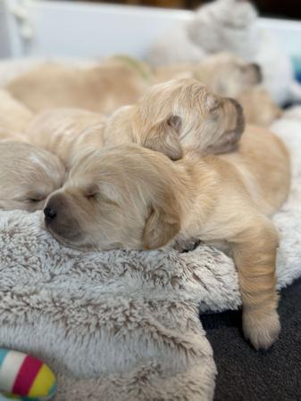 **confirmed pregnancy** From the moment a litter of puppies are born, they become my main focus for the next 8weeks. I spend lots of time handling and watching them. I believe their future temperament not only relies heavily upon how they are bred but how they are raised... Environmental factors and training once they leave here are also significant contributors to future behaviour. Our puppies are raised in a dedicated puppy area. In addition to a puppy friendly indoor space our puppies also have the opportunity to explore and enjoy the great outdoors. They have ample space to run, play, and explore, which contributes to their physical and mental well-being. No expense is spared when it comes to maintaining their health and wellbeing. Dam: ‘Mae’ Babbamiagold Keep in Touch & SIRE: ‘Thunda’ SOM. Supreme Ch Adoringgold Eye Of The Storm This litter is due to arrive during April.