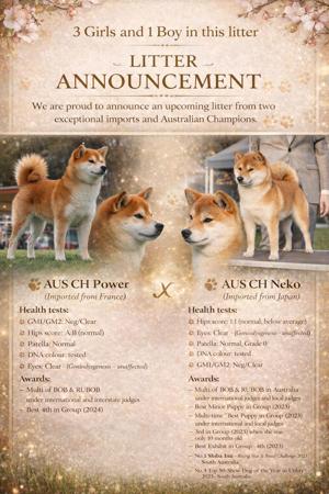 We are MASHUMAROSOU, a dedicated showing and ethical breeding kennel. We are pleased to announce that a red female puppy will be available and ready to join their new home. The puppy is from our beautiful parents, NEKO and POWER, both imported from France and Japan, proudly titled Australian Champions, and awarded multiple classes and groups in Australia. They have passed ALL required health testing, including HIPS, ELBOWS, PATELLA, EYES and DNA with RESULTS and CERTIFICATES available on our website and copies included in the puppy pack. All of our puppies are raised in our home as part of our family, surrounded by children and adult dogs. From an early age, they receive potty training, crate training, early socialisation, and desensitisation to everyday household noises such as the TV and vacuum. Puppies are also introduced to nail trimming, their first bath, and gentle handling to support confident temperaments. We focus strongly on temperament and breed true to the ANKC and NIPPO standards. Each puppy goes to their new home with a comprehensive puppy pack, including: Limited Pedigree 6 weeks of free insurance HEALTH CHECK CERTIFICATES COPIES OF MULTIPLE PARENTS’ HEALTH RESULTS Puppy training information Puppy raising guide Puppy food Treats and toy Blanket with mum’s scent Microchip First vaccination Lifetime support for all our puppy families We warmly welcome prospective families to meet our Shibas at shows before making a decision and contact us for more information.