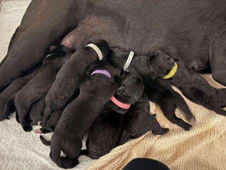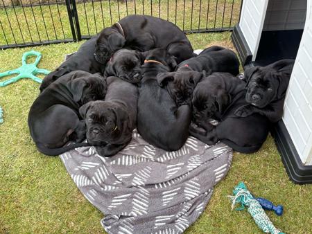 Redgladiator Izzy and Redgladiator Frankie welcomed 10 beautiful black puppies on the 17th March 2026 5 females and 5 males 2 females and 1 male still available All pups will be sold on limited registration, health checked, vaccinated and microchipped and come with a puppy pack that includes food, feeding guide, toy with mothers scent Please contact me for further information
