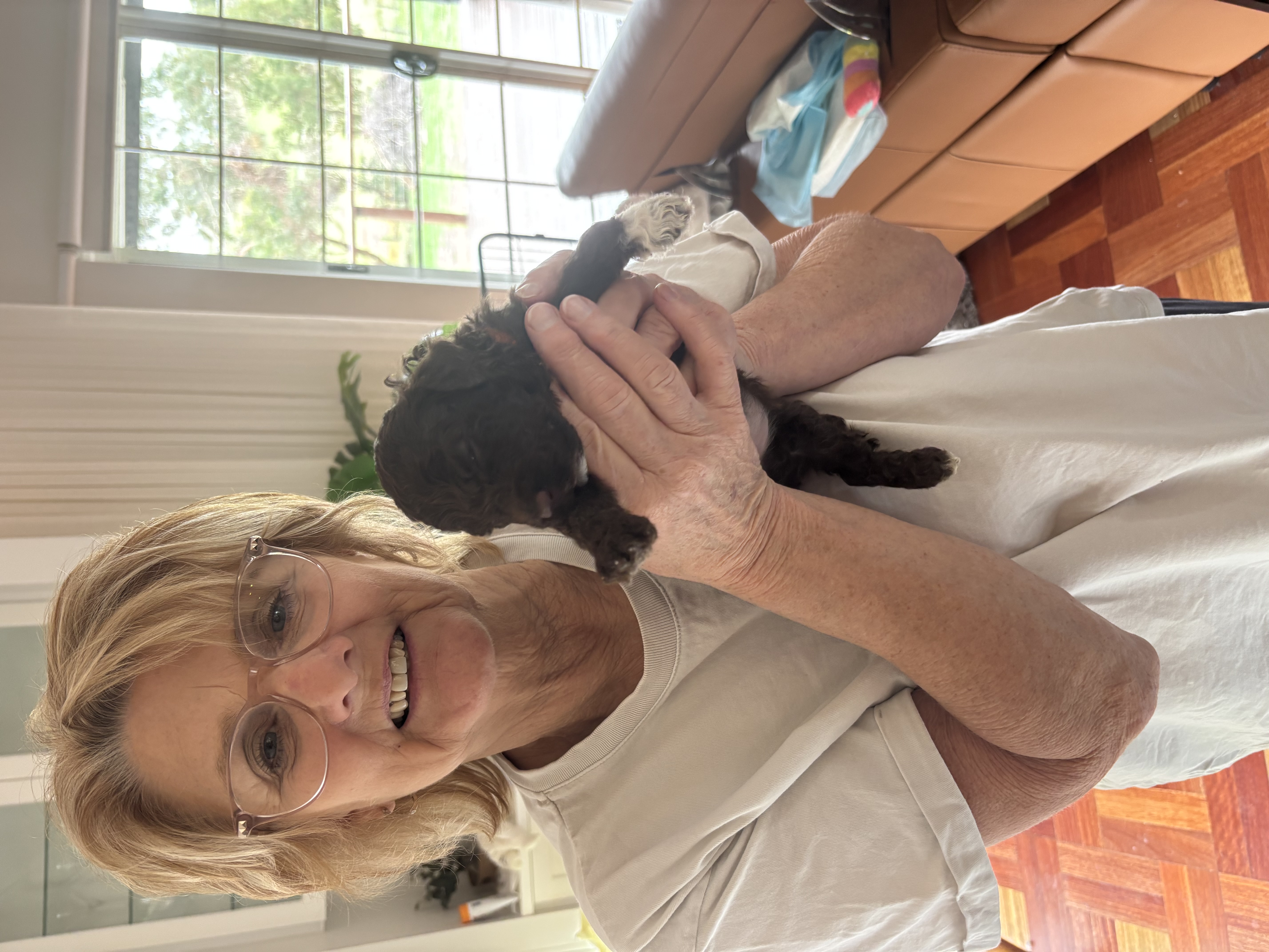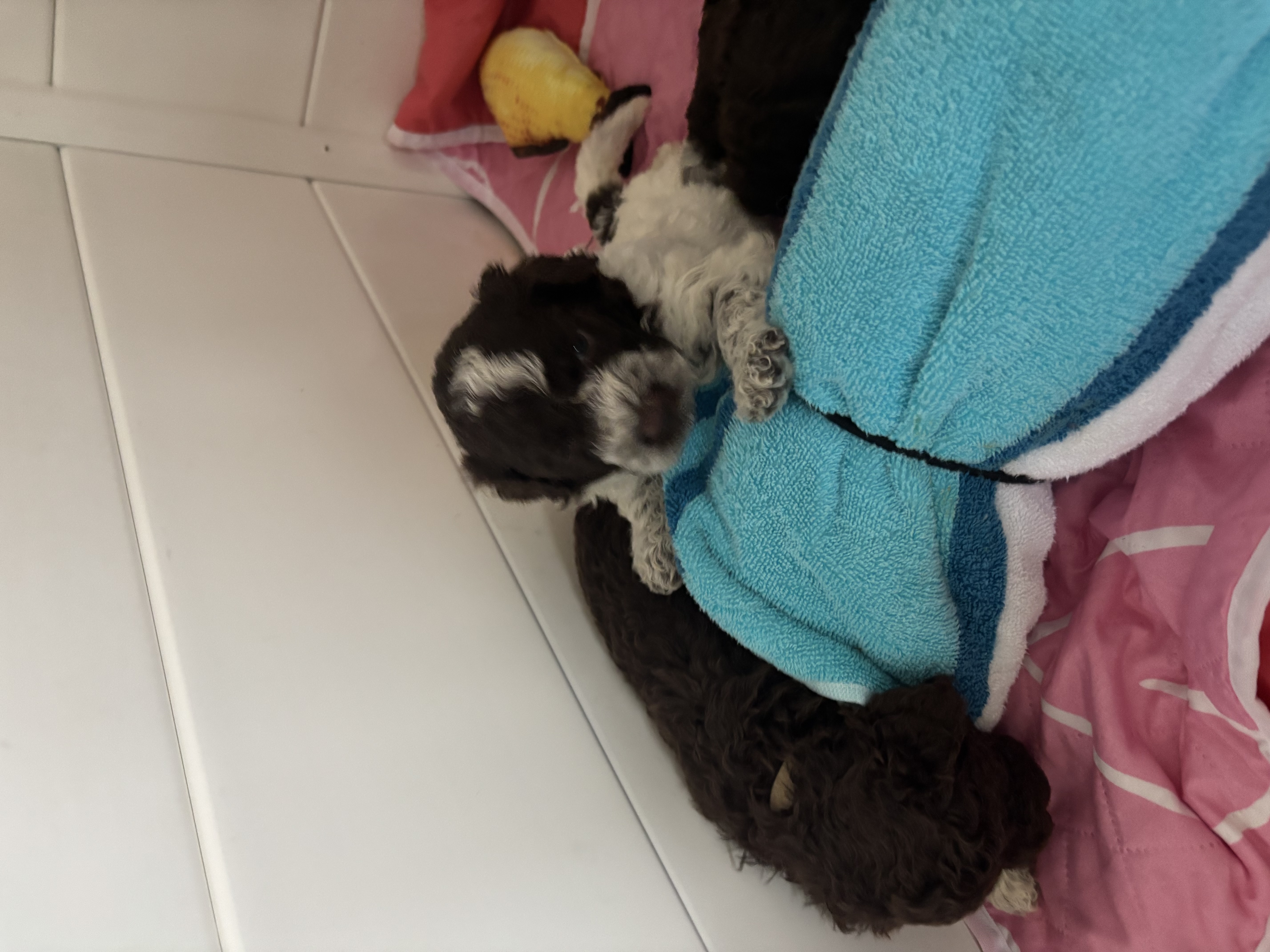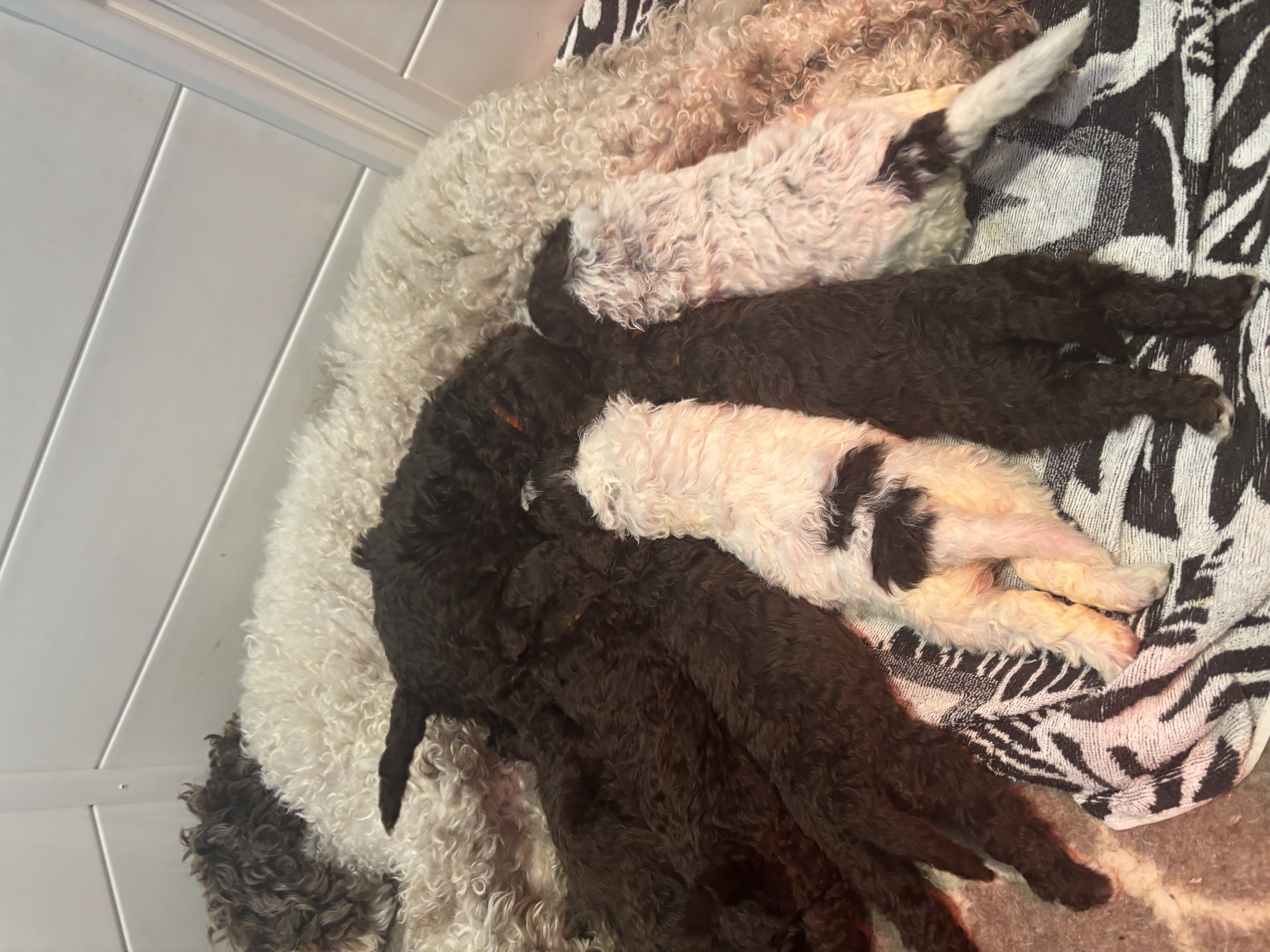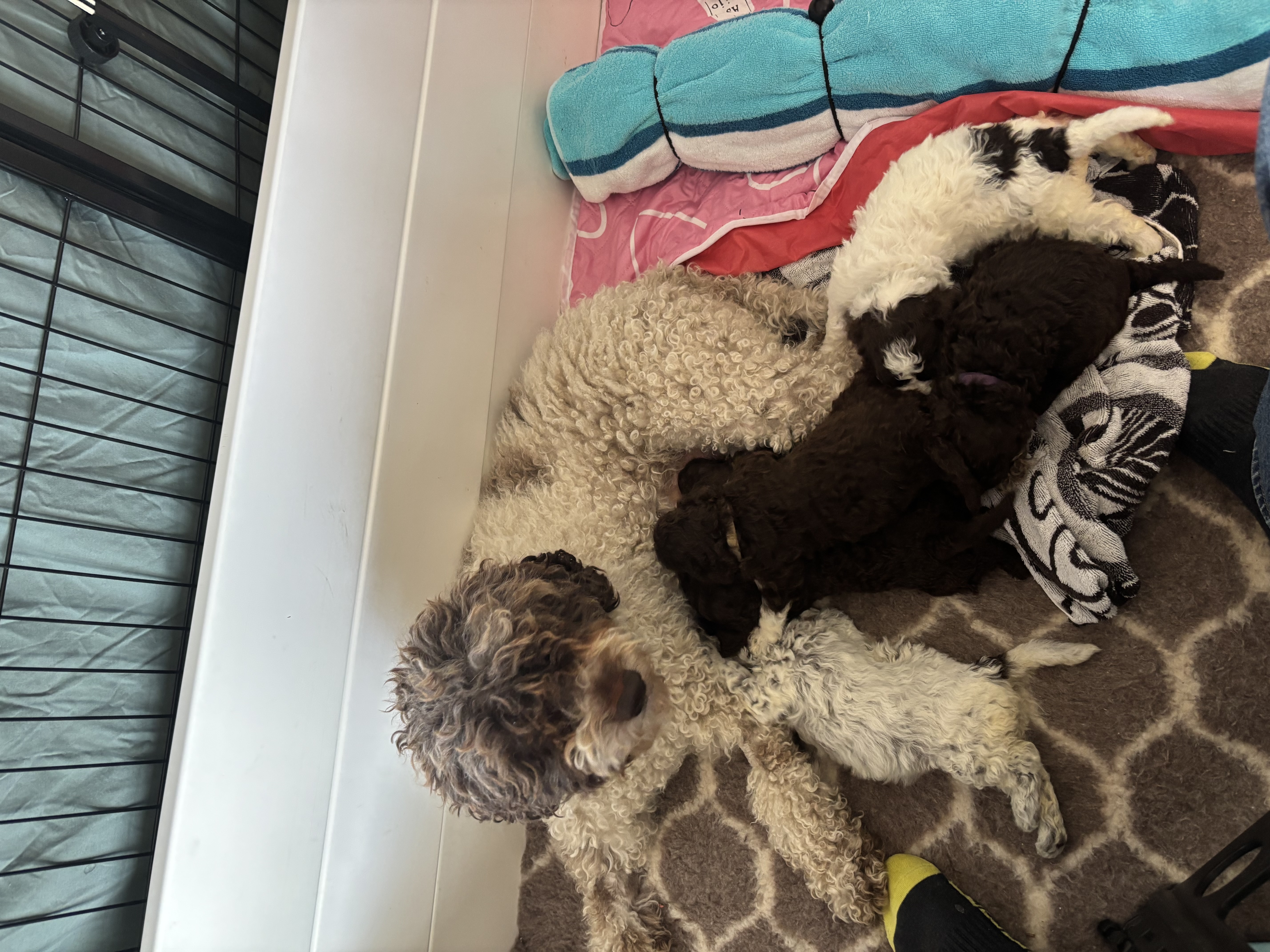 This was Bellas first Litter. It has been a wonderful experience and we are really enjoying the cuddles with the puppies. Trying to remember who's who, has been a challenge. They are growing so fast and are getting fluffier by the day. They are playing with each other now and enjoying all their toys. I can't stop videoing them and taking photos. Our two Lagotto are family to us and spend time every day inside but they do sleep in their crates at night. We are really hoping our puppies will be loved as much as we love our girls. They are like our children.