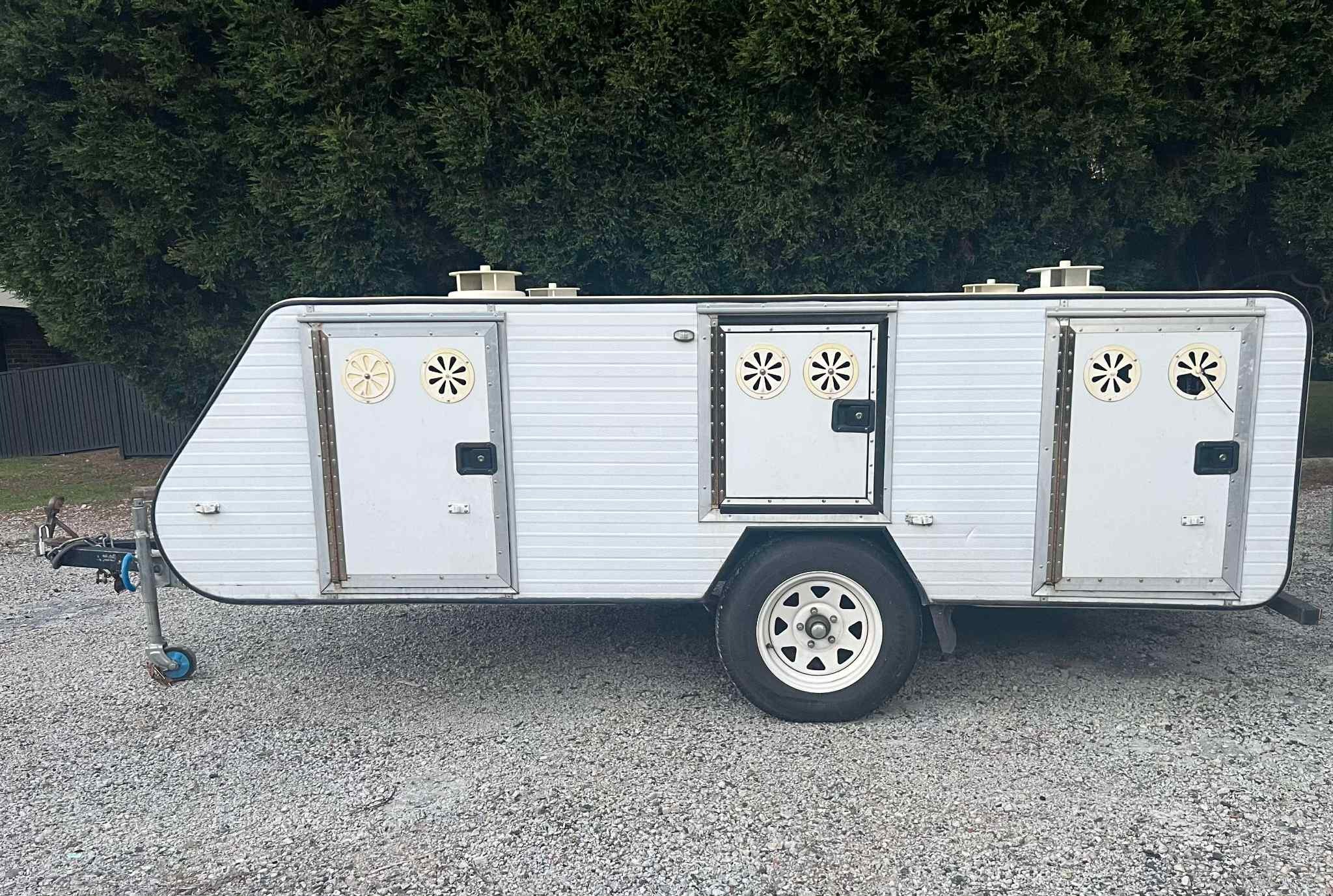 Air conditioned 6 berth Australia built. Can easily carry 8-10 Borzoi/Greyhound sized dogs. Has storage in the front cone and roof. Water tank in roof, generator on draw bar. Air conditioner replaced 2015 approximately, is a full house sized unit dropping the temperature to the teens when it's very hot outside. Has high quality Sunraysia rims with light truck tyers, spare mounted on the rear. Roll out shade on the roof, full electric brakes, trailer weighs 1250kgs.